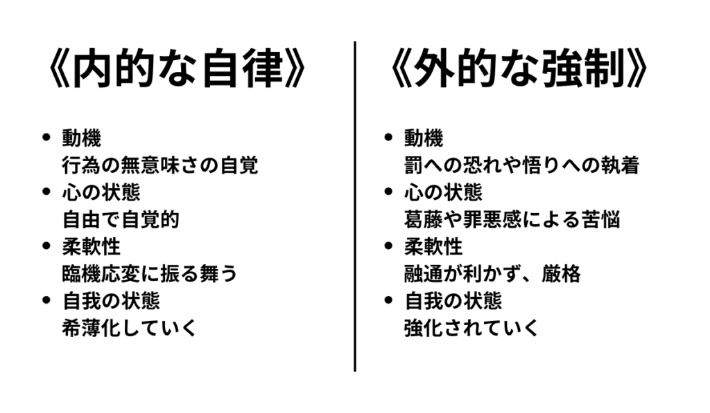 「内的な自律」と「外的な強制」に関する当人への影響の対比