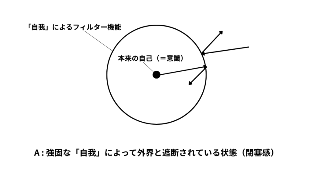 そして、こういった形で内外の交流が絶えず「自我」によって阻害されるために、当人は「閉塞感」「束縛感」を覚えます。