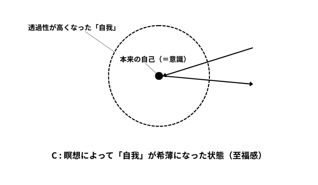 最後に、瞑想などの実践によって「自我」によるフィルター機能が弱まった人の状態が下図(C)になります。