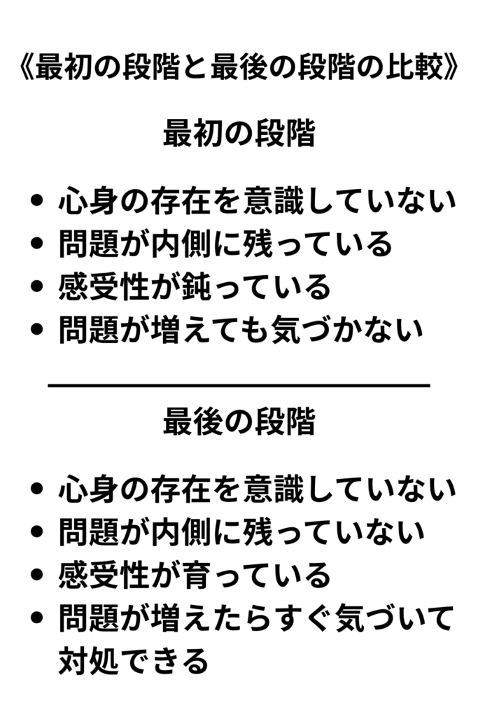 また、「感覚の深化」における最初の段階にいる人は、内側に「問題」があること自体に気づいていないため、仮に「新たな問題」が増えてもこれを自覚することができません。